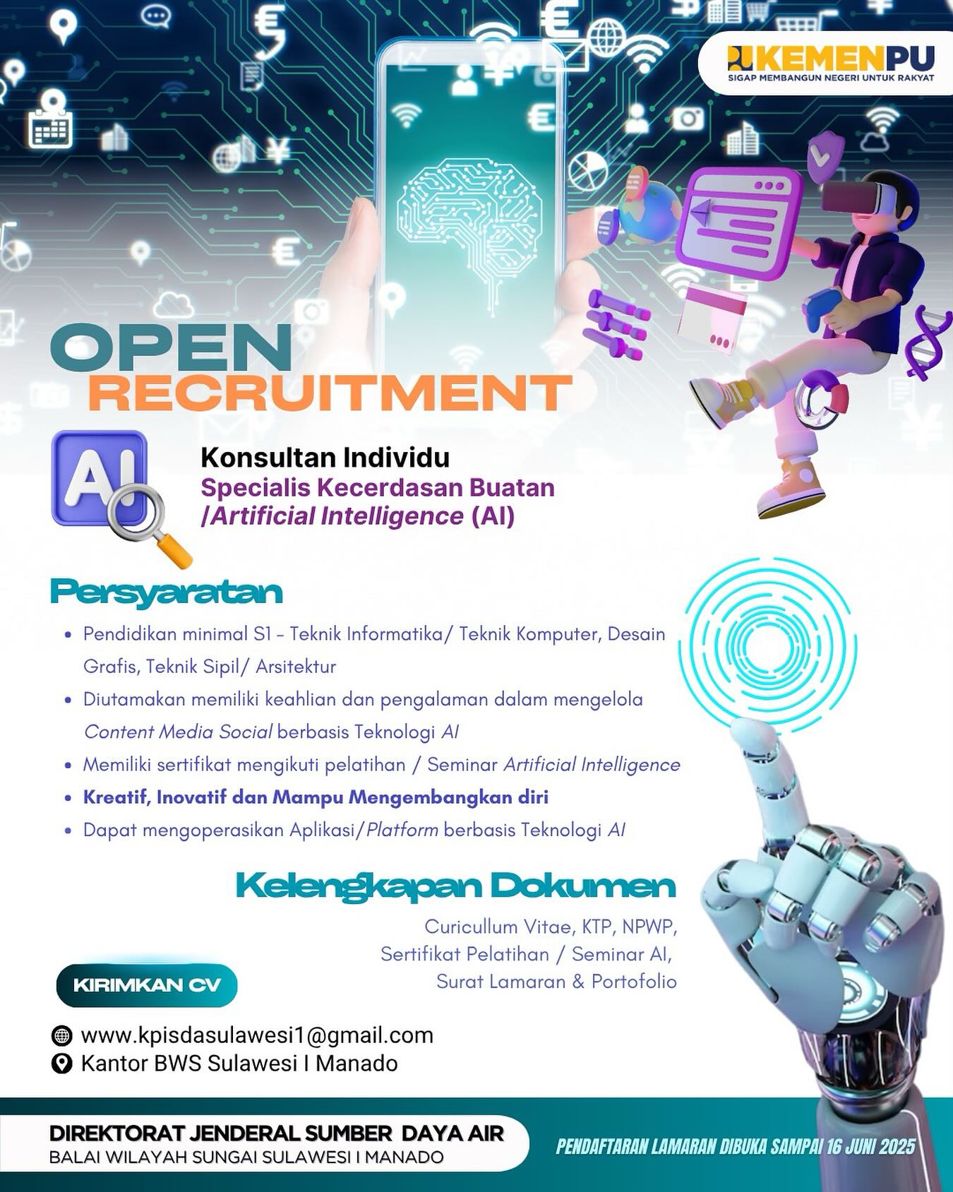 CENGOS.IN – BWS Sulawesi I Manado, mengadakan Open Recruitment Konsultan Individu Specialis Artificial Intelligence (AI),