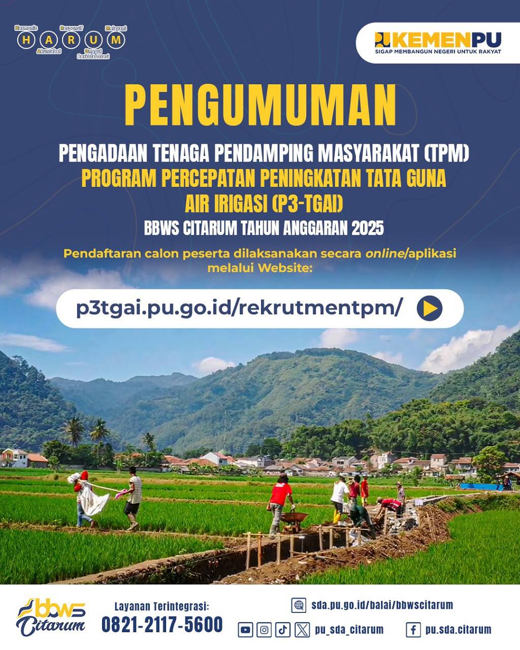Rekrutmen Pengadaan Tenaga Pendamping Masyarakat (TPM) Program Percepatan Peningkatan Tata Guna Air Irigasi (TP3-TGAI) Tahun Anggaran 2025 BBWS Citarum